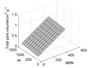 通過(guò)線性模型建立亞甲藍(lán)和碘值與總孔容的關(guān)系。使用由Kennard-Stone算法從39中選擇的10個(gè)樣本對(duì)表面進(jìn)行建模(圖5)。