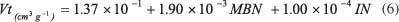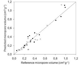 由于微孔由于其尺寸而優(yōu)先被碘分子存取,所以碘值也通過(guò)最小二乘回歸與微孔體積直接相關(guān)。然而,所獲得的誤差要高于考慮亞甲藍(lán)和碘值時(shí)的誤差。這表明亞甲藍(lán)在微孔體積預(yù)測(cè)中有一定貢獻(xiàn),可能是由于在較大微孔中的吸附。