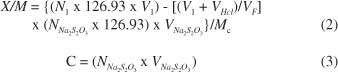碘值根據(jù)ASTM D4607-94方法測(cè)定。碘值定義為當(dāng)濾液的碘濃度為0.02N(0.02mol L -1)時(shí),被1.0g碳吸附的碘的毫克數(shù)。該方法基于三點(diǎn)等溫線。標(biāo)準(zhǔn)碘溶液在特定條件下用三種不同重量的活性炭處理。實(shí)驗(yàn)包括用10.0mL的5%HCl處理活性炭樣品。該混合物煮沸30秒,然后冷卻。之后不久,將100.0mL的0.1N(0.1mol L -1)碘溶液加入到混合物中并攪拌30秒。將所得的溶液過(guò)濾并50.0毫升濾液滴定用0.1N(0.1摩爾大號(hào)-1)硫代硫酸鈉,以淀粉為指示劑。每克碳吸附的碘量(X / M)相對(duì)濾液(C)中的碘濃度繪制,使用對(duì)數(shù)軸。如果殘留碘濃度(C)不在0.008-0.04 N(0.008-0.04 mol L -1)的范圍內(nèi),則每個(gè)等溫點(diǎn)應(yīng)使用不同的碳質(zhì)量重復(fù)整個(gè)過(guò)程。對(duì)這三點(diǎn)應(yīng)用最小二乘擬合回歸。碘值是殘留濃度(C)為0.02N(0.02mol L -1)時(shí)的 X / M值。所述X / M和C ^ 值分別由等式2和3計(jì)算。
