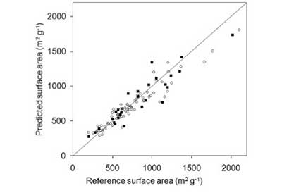 通過(guò)這個(gè)方程的表面積預(yù)測(cè)測(cè)試了新的樣品,考慮了我們獲得的文獻(xiàn)和數(shù)據(jù)中的數(shù)據(jù),總共78個(gè)測(cè)試樣品。在圖2中示出了由等式4預(yù)測(cè)的值與實(shí)驗(yàn)獲得的BET值之間的比較。