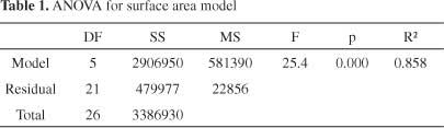 為了描述亞甲基藍(lán)和碘的數(shù)量相對(duì)于表面積的行為,使用二次模型。對(duì)于模型開發(fā),Kennard-Stone算法從105個(gè)樣本中選擇了27個(gè)樣本并用于校準(zhǔn)。樣品表面積從199到2105 m 2 g -1不等。亞甲基藍(lán)的數(shù)量在0到501毫克克每升之間,碘值從155到1670毫克克每升。建模后獲得的表面擬合(圖1)由公式4描述。