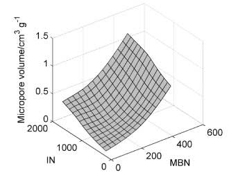 也使用二次模型將微孔體積描述為亞甲藍(lán)和碘值的函數(shù)。該模型在總共50個(gè)樣本的幫助下構(gòu)建,其中從KS算法中選擇了14個(gè)樣本進(jìn)行校準(zhǔn)。校準(zhǔn)范圍為0.05至0.99cm 3 g -1。從2至427毫克克變化亞甲藍(lán)號(hào)-1和碘號(hào)碼變化從195至1670毫克克-1。建模導(dǎo)致表面擬合(圖3),由公式5描述: