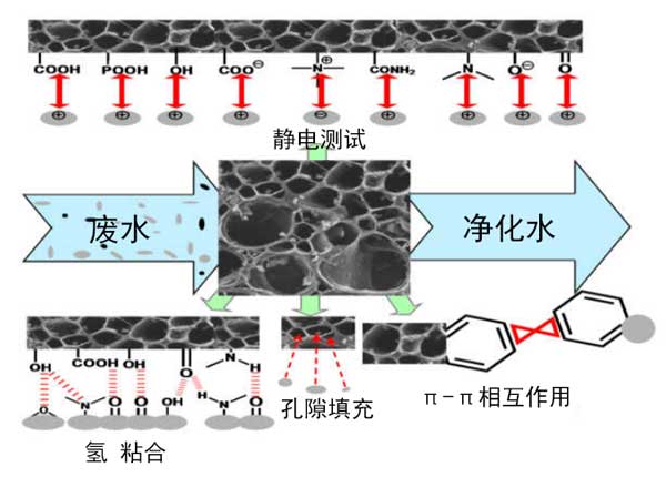 應該注意的是,對活化過程的理解是優(yōu)化活性炭制備的基本步驟。實際上,各種化學,物理和物理化學方法被用于從不同的天然或合成資源合成活性炭;瘜W處理涉及通過浸漬然后熱解使用活化劑,而物理過程涉及在蒸氣或二氧化碳存在下的高溫熱處理。但是,這兩種方法的組合也已用于生產(chǎn)活性炭。根據(jù)所采用的處理方法,很難預測碳的物理化學和形態(tài)特性。看來形態(tài),物理化學,質(zhì)地,通過改變活化時間和溫度以及所用前體的性質(zhì),活性炭的表面性質(zhì)會發(fā)生顯著變化;钚蕴勘砻娴幕瘜W性質(zhì)取決于存在于表面上的雜原子的類型,例如氧,氮,硫等。這些積累在表面上的雜原子或基團要么來自原材料本身,要么在活化過程中被引入。這在很大程度上與前體的性質(zhì)有關。所有這些特性對于使用碳作為水溶液中污染物的吸附劑具有重要意義。實際上,污染物在活性炭上的吸附是一個復雜的過程,在涉及物理作用和/或化學鍵的過程中,各種相互作用可以共存。從而,可能發(fā)生的吸附機理為靜電相互作用,氫鍵,π-π堆積相互作用,孔填充,疏水相互作用,離子交換以及其他相互作用(n-π相互作用等)和絡合反應。圖2說明了在活性炭上吸附污染物的主要相互作用方法。