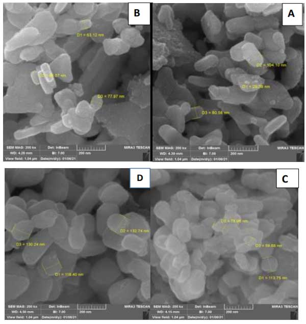未活化的活性炭與物理活化的活性炭復(fù)合材料的合成使用水熱法制備了。根據(jù)該方法,金屬化氧化鐵銅納米粒子懸浮在30mL燒杯中,直接加入活性炭懸浮液,超聲處理30分鐘。然后將這兩種懸浮液在一個(gè)燒瓶中混合,在80℃下連續(xù)攪拌,直到溶劑完全蒸發(fā)。此時(shí),收集所得固體并在100℃下干燥12小時(shí)獲得活性炭復(fù)合材料。利用掃描電鏡對(duì)合成的這幾種活性炭材料的表面形貌進(jìn)行了研究。純氧化鐵銅納米粒子的表面形態(tài)如圖1A所示,它顯示了中等均勻的球形顆粒,粒徑約為31nm;钚蕴繌(fù)合材料的圖像如圖1C所示,該圖像顯示了較小的均勻性,粒徑相對(duì)較大,并且存在顆粒團(tuán)聚。這很可能是由于復(fù)合材料中存在活化后的活性炭,這可以增強(qiáng)表面協(xié)同效應(yīng),促使顆粒尺寸增加,因?yàn)樵谶@些條件下晶體生長。復(fù)合材料氮鐵銅的圖像如圖1D所示,從該圖像可以看出,存在相對(duì)均勻的分布,球形顆粒幾乎與氧化鐵銅相似,但氧化鐵銅氮的粒徑相對(duì)大于氧化鐵銅。這可能是由于摻雜氮物種后晶體生長所致。
