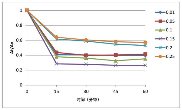 為了研究所用活性炭用量對(duì)其模擬水溶液中染料去除效率的影響,使用不同用量的活性炭復(fù)合材料進(jìn)行了一系列實(shí)驗(yàn)。這些質(zhì)量分別為0.01、0.05和0.10、0.15、0.20和0.25g。這些實(shí)驗(yàn)是在相同條件下進(jìn)行的,所有運(yùn)行的吸附時(shí)間為1小時(shí)。通過在468nm處測(cè)量吸光度來記錄上清液的吸光度來跟蹤吸附能力。從獲得的結(jié)果,發(fā)現(xiàn)用量為0.15g。如圖3所示,所用活性炭復(fù)合材料的染料去除效果好,如圖3所示。增加催化劑用量。這可能與隨著所用材料的質(zhì)量增加而增加可用吸附位點(diǎn)有關(guān)。這將導(dǎo)致在可用的吸附位點(diǎn)上吸附更多的染料分子。在使用大于0.15克的用量時(shí),染料去除效率會(huì)降低,這可以解釋為在使用高劑量吸附劑時(shí)會(huì)增加溶液的密度和材料顆粒的聚集。