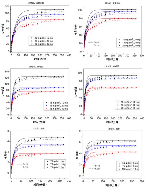 圖1:使用不同吸收濃度和活性炭用量對(duì)活性炭上雙氯芬酸、咖啡因和縮酮的動(dòng)力學(xué)吸附數(shù)據(jù)。