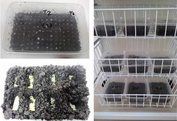 含活性炭和不含活性炭的纖維紙被切成3厘米x1厘米的條。這些紙在75℃下干燥48小時,干燥后的重量計算為初始干重。將紙張放入裝有堆肥土壤的塑料容器中,該土壤由農(nóng)業(yè)產(chǎn)業(yè)生產(chǎn)的堆肥生活垃圾制成,濕度為45%,并用多孔蓋子蓋住。試驗(yàn)組由12次重復(fù)組成,觀察12周,間隔4周(3次采樣)。采樣時間表示為T1、T2和T3。初始條件表示為T0。在取樣時,取出紙片并用軟刷清潔。土壤中生物降解試驗(yàn)的描述如圖1所示。