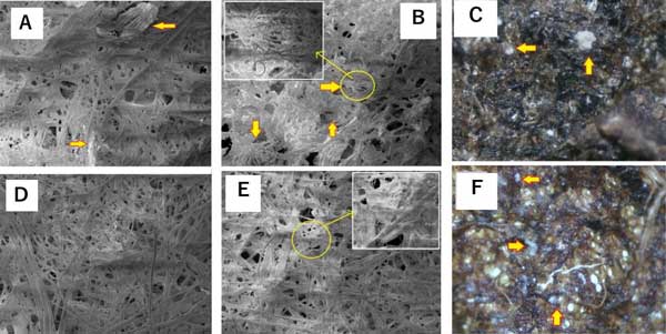 圖3:紙表面的顯微外觀(50倍放大),(A)在生物降解測試前帶有納米活性炭/纖維素紙;(BC)經(jīng)生物降解試驗(yàn)后的納米活性炭/纖維素紙;(D)纖維素紙僅在生物降解試驗(yàn)之前;(EF)纖維素紙僅經(jīng)過生物降解測試。黃色狹窄對應(yīng)于來自土壤的真菌菌絲體,插入的圖像放大250倍。