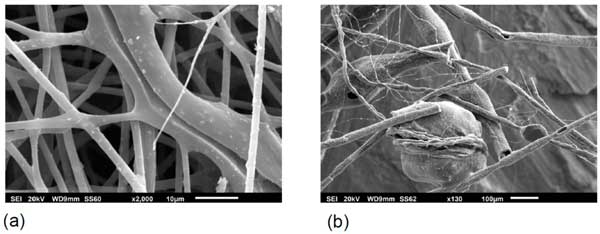 圖1:不同尺寸的氧化物顆粒/纖維(a)和復合纖維(b)的SEM圖像。