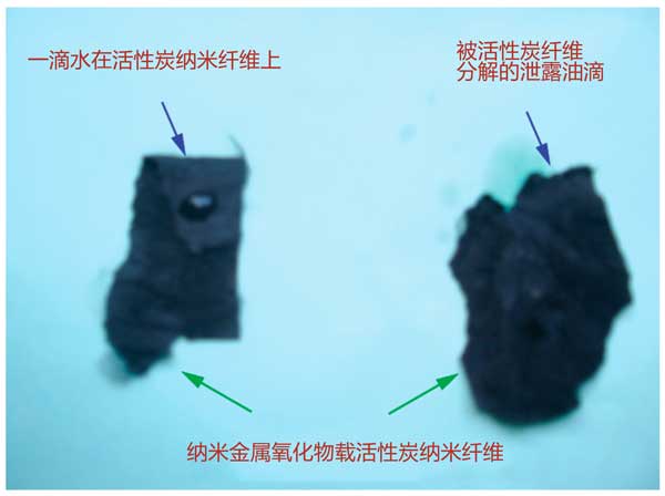 圖4:顯示活性炭復合纖維疏水和親油行為的照片。