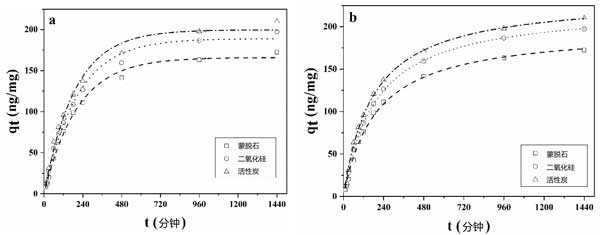 圖2:(a)黃曲霉毒素在活性炭和其它吸附劑上吸附的擬一級(jí)動(dòng)力學(xué)模型擬合曲線(xiàn)和(b)擬二級(jí)動(dòng)力學(xué)模型擬合曲線(xiàn)。