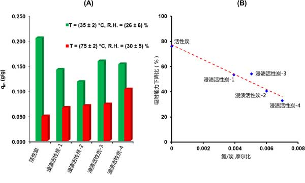 甲基碘吸附容量的降低程度取決于活性炭的性質(zhì)(圖2(A))。正如預(yù)期的那樣,對于未浸漬的吸附劑觀察到有害的影響,其中僅已知不涉及CH3I吸附的特定相互作用。更準(zhǔn)確地說,當(dāng)從活性炭材料的第一組條件轉(zhuǎn)移到第二組條件時(shí),概述了大約76%的吸附容量下降(圖2)。在這方面,為了克服與水蒸氣和溫度相關(guān)的影響,三乙二胺浸漬是必不可少的。最近,由于水對三乙二胺分子具有很強(qiáng)的親和力,因此三乙二胺浸漬可以通過釋放載體的活性位點(diǎn)來提高活性炭的保留性能]。此外,與其他機(jī)制(尤其是物理吸附)相比,化學(xué)吸附甲基碘的比例隨著溫度升高而增加。然后,三乙二胺與甲基碘的化學(xué)反應(yīng)性將在較高溫度下增強(qiáng)。得到的結(jié)果(圖2)表明隨著氮含量的增加,在“惡劣條件”下的保留性能逐漸提高。因此,以浸漬中含量最高為特征的活性炭-4吸附劑的吸附容量僅降低了33%。更準(zhǔn)確地說,可以推斷出所有考慮的吸附劑的減少幅度和摩爾比之間的準(zhǔn)線性關(guān)系(圖2B)。根據(jù)這種關(guān)系,似乎需要浸漬,以確保在更嚴(yán)格的條件下更牢固地固定甲基碘。