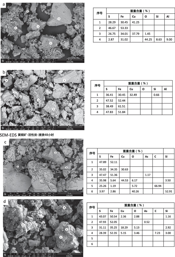 在浸出殘?jiān)邪l(fā)現(xiàn)的其他礦物種類是黃銅礦、黃鐵礦、閃鋅礦和石英。氧化還原電位必須足夠低才能形成Cu2S,而黃鉀鐵礬沉淀在非常高的氧化還原電位下更受青睞。通過(guò)SEM-EDS對(duì)初始活性炭樣品(圖3a)和浸出殘留物(圖3b和3c)的分析表明存在黃銅礦、黃鐵礦和初始精礦中的小石英顆粒。浸出48小時(shí)后(圖3b),固體殘留物顯示存在黃銅礦,表面因浸出而改變黃鐵礦。對(duì)活性炭浸出48小時(shí)后獲得的殘留物的分析表明存在黃鐵礦、吸附硫的碳,并且一些黃銅礦顆粒發(fā)生了很大的變化,表明從黃銅礦中優(yōu)先浸出Fe而不是Cu。