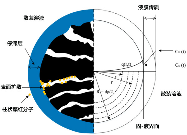 在第一實驗階段獲得的吸附平衡測試的實驗數(shù)據(jù)適合等溫線模型Langmuir、Freundlich和Redlich-Peterson。將最適合吸附平衡數(shù)據(jù)的等溫線模型的參數(shù)值應用于HSDM模型,以模擬SBA柱中的吸附過程。該模型考慮了發(fā)生在兩個連續(xù)擴散步驟中的吸附過程,即:通過活性炭顆粒周圍的固定流體層擴散(膜擴散)和通過活性炭內(nèi)部孔的擴散(表面擴散),如圖2所示。