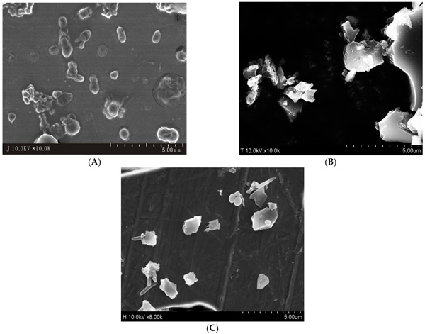 圖2:掃描電子顯微鏡圖像:(A)降解細菌;(B)活性炭;(C)活性炭載菌。