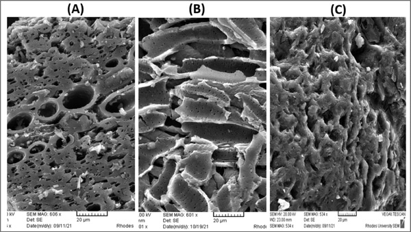 圖1:(A)活性炭顆粒、(B)氧官能化活性炭顆粒和(C)活性炭載卟啉的SEM圖像。