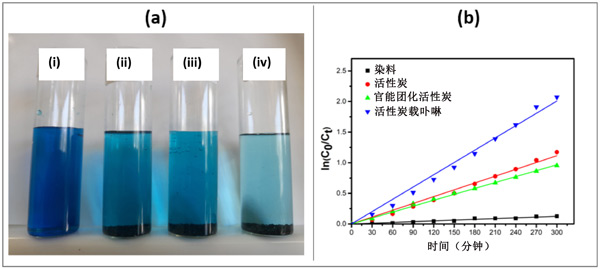圖3:(a)過濾可見光照射5小時后MB溶液的照片。(i)單獨的MB,(ii)MB與活性炭,(iii)MB與官能團化活性炭,和(iv)MB與活性炭載卟啉,(b)亞甲藍降解的動力學線性模擬曲線。