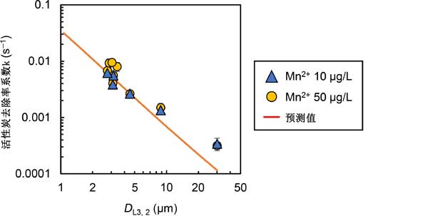 我們將Mn2+去除率系數(shù)(k)與活性炭的粒徑進(jìn)行了比較(圖3)。我們使用源自相同活性炭的九種尺寸的碳顆粒繪制了實(shí)驗(yàn)數(shù)據(jù),以便與方程式的預(yù)測(cè)進(jìn)行比較。實(shí)驗(yàn)值和預(yù)測(cè)值幾乎一致,并且在雙對(duì)數(shù)圖上都顯示出線性關(guān)系。仔細(xì)觀察發(fā)現(xiàn),預(yù)測(cè)值的斜率比實(shí)驗(yàn)值更陡,在較大顆粒范圍內(nèi),實(shí)驗(yàn)值略大于預(yù)測(cè)值。這可能是由于顆粒形狀或表面性質(zhì)的任何差異:我們假設(shè)了一系列參數(shù)值,包括球形值,這些預(yù)測(cè)與顆粒大小無(wú)關(guān),但在實(shí)際的活性炭中,這些值可能隨顆粒大小而變化?傮w而言,活性炭的粒徑對(duì)Mn2+去除性能有很大影響。