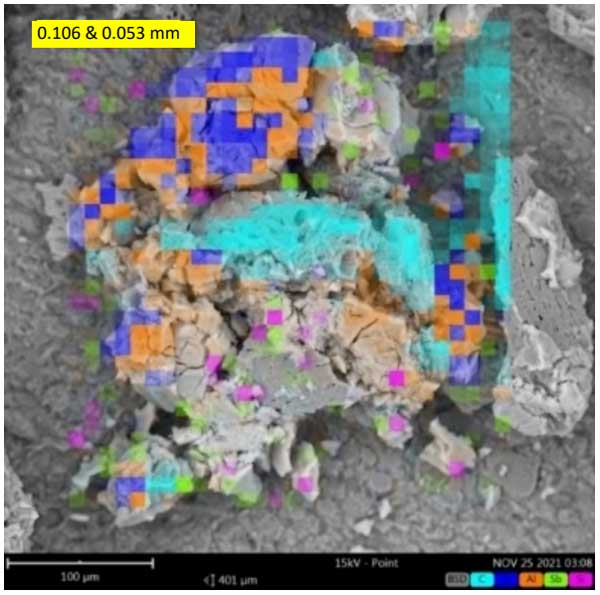 水性介質(zhì)最終溶液中的元素通過測(cè)定。溶液中存在的元素可以來自電極氧化、活性炭孔隙中的元素提取以及水介質(zhì)中使用的硬水中的元素。在測(cè)試中,由于電凝過程中的廣泛氧化,F(xiàn)e水平低于Fe量化限值(0.01mg/L)。使用0.106毫米大小的活性炭顆粒的電凝工藝在鋁電極上實(shí)現(xiàn)了比鐵電極更均勻的涂層,如750倍和600倍放大率下的活性炭顆粒的SEM圖像所示(見圖1);钚蕴拷Y(jié)果中存在的多元素在王水中消解并通過ICP-OES表征,通過電極的氧化、活性炭顆粒的凝聚和水介質(zhì)硬水中所含金屬的吸附而增加。