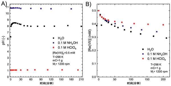 在不同溶液中解吸的動力學曲線。在過程的初始階段解吸率最高。當大約91%的金屬解吸到0.1M/HClO4中時,計算最終濃度。在這種情況下,錸化合物的再溶解與解吸一起發(fā)生。水的特點是解吸率最低;只有15%的Re被解吸。在0.1M/NH4OH的情況下,3小時后的最終濃度為0.093mM,38%的Re被解吸。然而,0.1M/NH4中的錸濃度OH在解吸的第一個小時內(nèi)增加,之后略有下降。