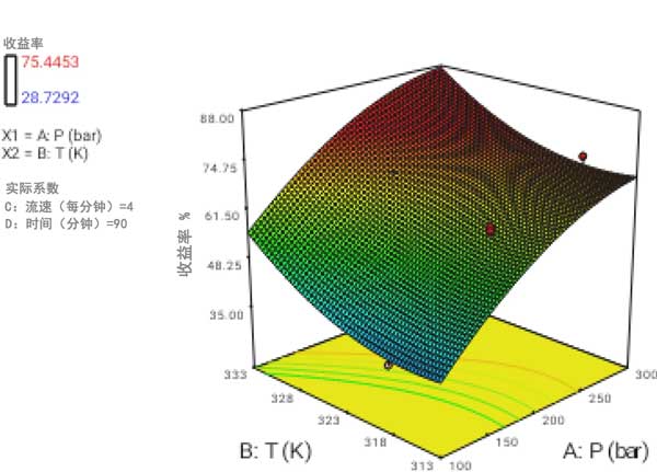 在本節(jié)中,使用三維圖檢查了不同操作參數(shù)對(duì)活性炭超臨界再生的影響,而其他變量保持在其各自固定的中間水平(壓力,200bar,溫度45℃,流速,4g/分鐘和時(shí)間90分鐘),對(duì)應(yīng)于零代碼。圖2顯示了壓力和溫度影響的3D圖。可以觀察到,再生產(chǎn)率隨著壓力和溫度分別從100bar增加到300bar和從40增加到60℃而增加。基于中心復(fù)合設(shè)計(jì),壓力對(duì)再生產(chǎn)率的影響最重要。特別是,壓力的增加導(dǎo)致CO2的溶解能力增加,因此溶質(zhì)的溶解度也增加。另一方面,溫度的升高對(duì)再生產(chǎn)量有輕微的積極影響。在100~300bar的壓力下,隨著溫度的升高,溶質(zhì)的溶解度增加,這是由于溶質(zhì)蒸氣壓增加的作用。因此,溶質(zhì)的溶解度隨著溫度的升高而增加。另一方面,提取物蒸氣壓隨著溫度升高而升高,這導(dǎo)致超臨界流體擴(kuò)散率增強(qiáng)。