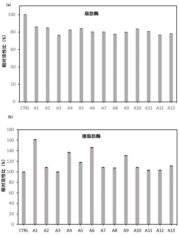 圖2:(a)固定在A1至A13的活性炭樣品上后,脂肪酶的相對活性。數(shù)據(jù)以95%的置信區(qū)間(誤差線)呈現(xiàn)。(b)固定在活性炭樣品上后豬脂肪酶的相對活性從A1到A13。