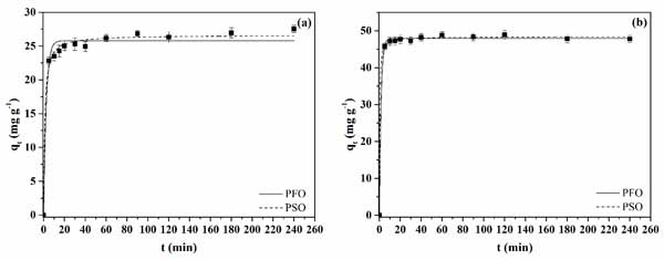 研究了初始吸附物濃度為50mgL-1和pH4的兩種活性炭的亮藍染料染料吸附動力學行為。作為時間函數(shù)的吸附容量曲線分別如圖3a、b所示,分別為活性炭1和2。可以觀察到活性炭2獲得的曲線的特征在于更快的吸附速率;钚蕴2在大約10分鐘內達到平衡。對于活性炭1,在大約60分鐘內達到平衡。由于活性炭1呈現(xiàn)的較高總孔體積,可以解釋這種行為。高孔體積可以通過允許染料分子在孔內更快地擴散到吸附位點來增強吸附動力學。