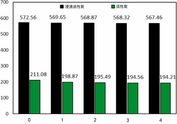 為了研究吸附劑吸收汽油蒸汽的性能,我們進(jìn)一步評估了樣品在吸附-解吸循環(huán)中的可重復(fù)使用性。在恒溫下,1小時后,當(dāng)吸附劑達(dá)到飽和狀態(tài)時,浸漬再生過程。四個吸附循環(huán)后,蒸汽吸附容量為567mg/g,所用吸附劑保持大量吸收分子。HMTA-AC-D樣品表明蒸汽吸收略有減少約0.89%,而活性炭樣品的這一量為7.9%(圖3)。在高循環(huán)下,由于孔隙的逐漸破壞和不完全脫氣,吸收量可能會顯著降低。根據(jù)我們的發(fā)現(xiàn),與文獻(xiàn)相比,制成的吸附劑在物理和熱學(xué)上表現(xiàn)出更高的穩(wěn)定性。這些結(jié)果表明,樣品在回收汽油蒸汽時具有很高的可持續(xù)性,可以作為一種有效的吸附劑提出并考慮。