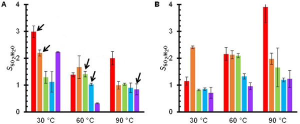 圖1:五種活性炭在濕煙氣與干煙氣混合物中吸附的SO2量。圖中顯示了T=30℃(藍(lán)色)、60℃(綠色)和90℃(紅色)實驗結(jié)果。