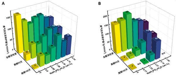使用Na2HPO4·2H2O添加劑的實驗在6.52%的濃度下進行,其摩爾當量相當于5.15%的NaH2PO4·H2O濃度。圖3的結果表明,Na2HPO4·2H2O添加劑也能有效防止失活,但不如NaH2PO4·H2O有效。例如,失活180天后,防護值含有Na2HPO4·2H2O添加劑的活性炭濃度下降至65mg/min/m3相比之下,使用NaH2PO4·H2O添加劑的活性炭為107mg/min/m3。