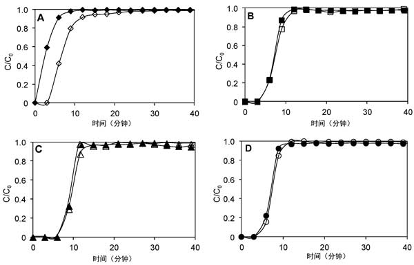 圖2:有無水分對乙烯吸附的影響:(A)未活化的活性炭,(B)活性炭,(C)浸漬氧化銅的活性炭,(D)氧氣氣氛中的活性炭。