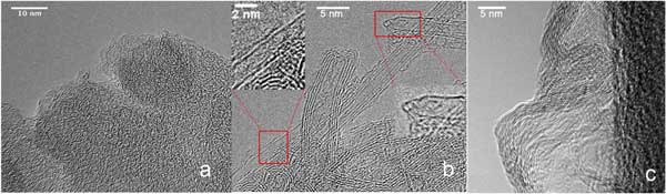 選擇了三種活性炭,代表三種不同的孔幾何形狀,同時保留了化學均一的吸附表面和可比較的孔徑。選定的樣品是由隨機排列的石墨層組成的活性炭,具有狹縫孔幾何形狀的碳化鈦衍活性炭和具有圓柱孔幾何形狀的活性炭納米管樣品。對活性炭納米管進行熱處理,以去除端蓋,并使氣體進入內(nèi)部孔隙。選擇加熱條件以將活性炭納米管的開孔率和BET表面積調(diào)整到與其他兩個碳樣品相當?shù)乃,同時還清潔表面并去除雜質(zhì)。所有三個樣品的特征如下:使用透射電子顯微鏡(TEM)圖1證明了這些材料的孔幾何形狀的差異。