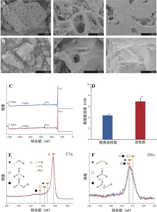 圖1:(A)欖殼活性炭和(B)活性炭在一系列放大倍數(shù)下的SEM顯微照片,(C)XPS調查掃描,(D)表觀氧元素濃度,(E)碳信號,(F)氧濃度之間的顯著差異。