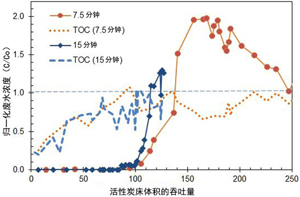 空床接觸時(shí)間對(duì)突破的影響說(shuō)明如下:圖2用于123-三氯丙烷。盡管7.5分鐘和15分鐘EBCT的123-三氯丙烷突破的開(kāi)始是相似的,但在100,000床體積之后,與7.5分鐘EBCT相比,15分鐘EBCT的突破更早。更長(zhǎng)的EBCT容量降低可能是活性炭結(jié)垢的結(jié)果,這是由于更強(qiáng)的吸附力和不可置換的DOM到達(dá)吸附床的更深處,并超過(guò)了目標(biāo)有機(jī)物的吸附位點(diǎn)和/或覆蓋了活性炭顆粒的孔而導(dǎo)致的。時(shí)間并防止進(jìn)一步的目標(biāo)有機(jī)物吸附。通過(guò)比較相似突破點(diǎn)的吞吐能力差異,說(shuō)明了EBCT對(duì)其他cVOC的活性炭性能的影響,其中負(fù)值表示在15分鐘EBCT時(shí)容量更大,正值表示在7.5分鐘EBCT時(shí)容量更大(或在15分鐘EBCT時(shí)容量較小)。床體積數(shù)量達(dá)到突破的10%,50%或75%的平均容量差異(不包括VC,因?yàn)槲丛u(píng)估15分鐘EBCT)分別為-0.1%,9%和13%,表明在運(yùn)行時(shí)容量沒(méi)有損失。15分鐘的EBCT突破了10%,突破了適度的容量,因?yàn)楦L(zhǎng)的EBCT結(jié)垢了,因此突破了50%和75%。