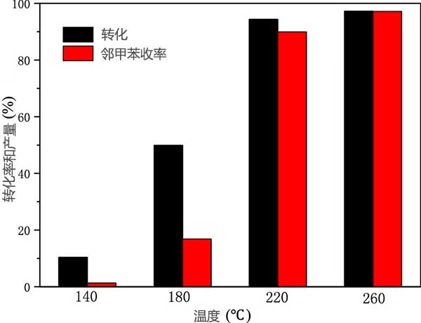 圖2:反應(yīng)溫度對活性炭載磷化鎳在氫氣壓力下對SA的加氫脫氧催化性能的影響。