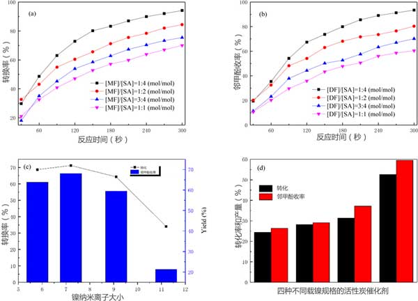 盡管碳水化合物衍生的化合物在加氫脫氧過程中對芳族化合物有影響,但是之前的一些熱解油升級的研究集中在加氫脫氧反應(yīng)中碳水化合物衍生的化合物和木質(zhì)素衍生的芳族化合物之間的相互作用。在這次研究中,用活性炭催化從酚級分(SA)產(chǎn)生的碳水化合物衍生物的(MF)的加氫脫氧的熱解油的效果進行了研究(在圖3所示)。MF的存在對SA的轉(zhuǎn)化和鄰甲酚的收率產(chǎn)生了很大的影響。在不存在MF的情況下,SA的轉(zhuǎn)化率為99%,持續(xù)180分鐘,相應(yīng)的鄰甲酚產(chǎn)率為97%。隨著反應(yīng)物中MF比例的增加,SA轉(zhuǎn)化率和鄰甲酚產(chǎn)率均顯著降低。當(dāng)(MF)/(SA)值為1.00(mol / mol)時,SA的轉(zhuǎn)化率和鄰甲酚的收率分別從99%和97%急劇下降至70%和60%,這表明通過在反應(yīng)物中存在MF,抑制了SA的反應(yīng)性。