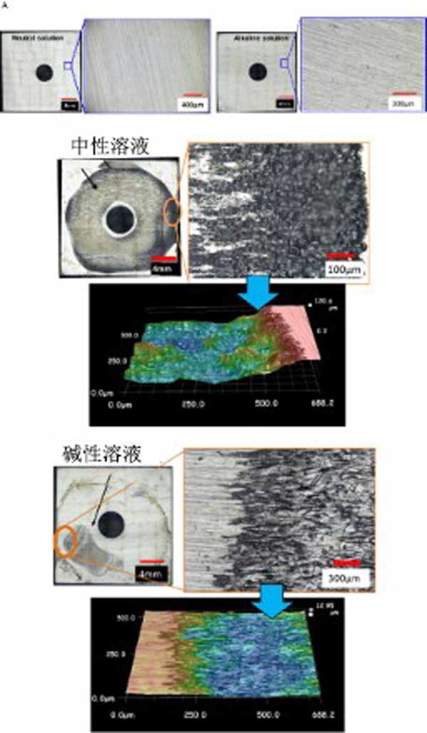 使用光學(xué)顯微鏡觀察實(shí)驗(yàn)后樣品的表面形態(tài),如圖3所示。在中性和堿性溶液中未與活性炭接觸的樣品中未觀察到縫隙腐蝕。另一方面,在中性和堿性測(cè)試溶液中與活性炭接觸的樣品上發(fā)生縫隙腐蝕。這些結(jié)果清楚地表明,當(dāng)樣品與活性炭接觸時(shí),縫隙腐蝕敏感性增加。在中性測(cè)試溶液的情況下,最大腐蝕深度為130μm并且縫隙腐蝕傳播以覆蓋樣品的幾乎所有褶皺區(qū)域。在堿性測(cè)試溶液的情況下,最大腐蝕深度為25μm并且腐蝕區(qū)域遠(yuǎn)小于中性溶液的情況。這些結(jié)果表明,在中性溶液的情況下腐蝕區(qū)域和深度更大,這表明在吸附塔中發(fā)生實(shí)際腐蝕。在堿性溶液的情況下腐蝕面積和深度較小的原因被認(rèn)為是Fe(OH)2的溶解速率的事實(shí)堿性溶液減少,這導(dǎo)致腐蝕速率降低;旧,在陽極部位的pH降低至去鈍化pH是縫隙腐蝕開始和傳播所必需的。考慮到這個(gè)方面,還可以解釋縫隙腐蝕行為的差異。